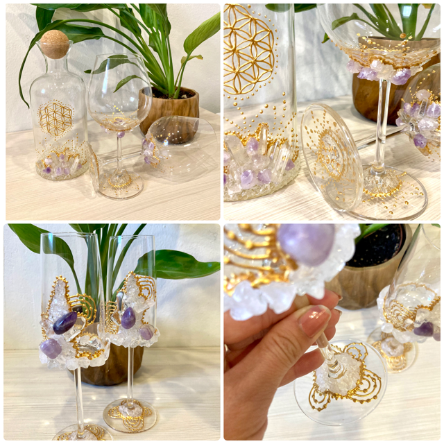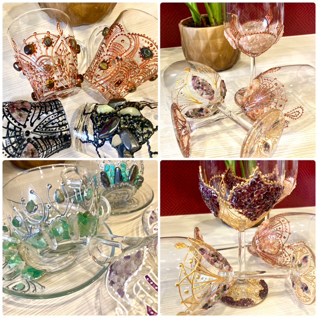V poslední době se ve své tvorbě věnuji také propojování malby se zdobením sklenic pomocí minerálů a kamenů. Tyto prvky přidávám citlivě jako součást celku a přirozené práce s materiálem.